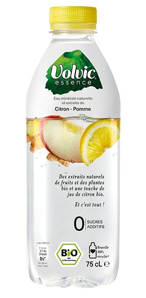 Eau minérale naturelle de Volvic (98,3 %), jus de citron biologique à partir de concentré de jus de citron (1,3 %), extrait de pomme, extrait de citron, extrait de gingembre.